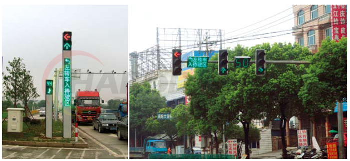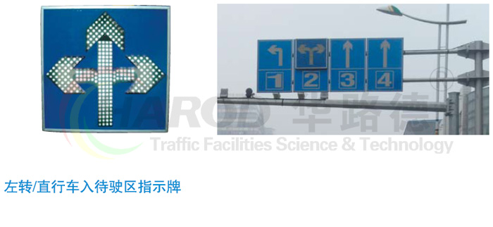 可變車道標(biāo)牌用于對(duì)道路需要根據(jù)車流量定時(shí)切換車道行駛方向的場(chǎng)合,由兩部分組成: