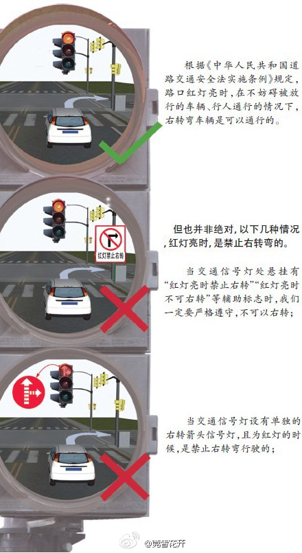 紅燈亮?xí)r,右轉(zhuǎn)彎的車輛在不妨礙被放行的車輛、行人通行的情況下,可以通行。但以下情況是禁止右轉(zhuǎn)彎的:1.當(dāng)交通信號燈處懸掛有 “紅燈亮?xí)r禁止右轉(zhuǎn)”等輔助標志時,不可以右轉(zhuǎn);2.當(dāng)交通信號燈設(shè)有單獨的右轉(zhuǎn)箭頭信號燈,且為紅燈的時候,是禁止右轉(zhuǎn)彎行駛的。