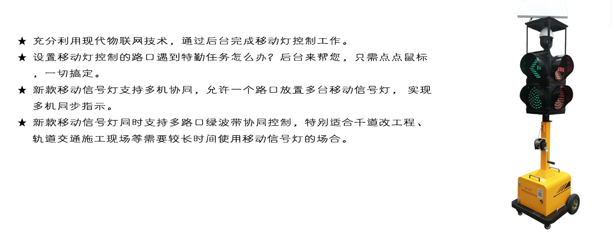 華路德新款HD-9系列移動(dòng)信號(hào)燈,利用現(xiàn)代物聯(lián)網(wǎng)技術(shù),通過后臺(tái)完成移動(dòng)燈控制工作。支持多機(jī)協(xié)同,允許一個(gè)路口放置多臺(tái)移動(dòng)信號(hào)燈,實(shí)現(xiàn)多機(jī)同步指示。新款移動(dòng)信號(hào)燈支持多路口綠波帶協(xié)同控制。