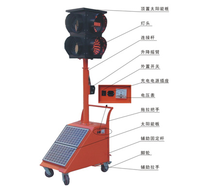 太陽(yáng)能移動(dòng)信號(hào)燈采用高亮度LED發(fā)光管作為發(fā)光材料,蓄電池+太陽(yáng)能電池板作為電源,外形采用一體式結(jié)構(gòu),所有部件均嵌入其中,具有外形美觀,移動(dòng)方便、操作簡(jiǎn)單等特點(diǎn),特別適用于臨時(shí)路口的交通控制。