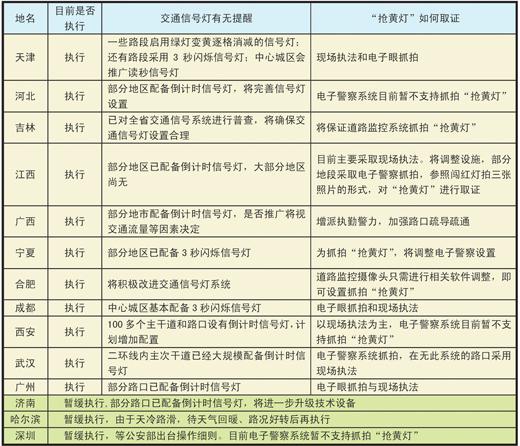 根據(jù)相關(guān)省市交管部門提供的信息,大多數(shù)地方交管部門將嚴(yán)格執(zhí)行對搶黃燈的處罰措施,小部分城市表示因電子警察系統(tǒng)暫不支持抓拍搶黃燈、等待公安部出臺操作細(xì)則、冬季冰雪路面導(dǎo)致路口標(biāo)線模糊不清等原因?qū)壕張?zhí)行。