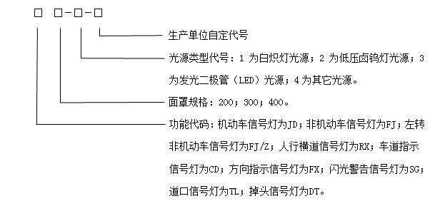 信號燈的型號由功能分類代碼、面罩規(guī)格、光源類型代號和生產(chǎn)單位自定代號組成。